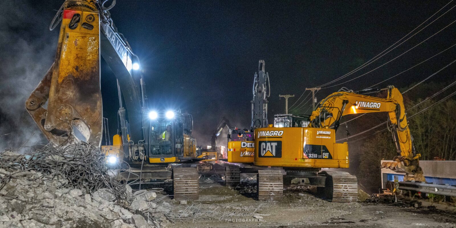 J.R. Vinagro accepted the challenge of replacing Bridge 896 over Route 138 and resurfacing 6.5 miles of highway on Rt 1 (Tower Hill Rd) in North Kingstown. The replacement of this bridge involved replacing the superstructure and installing a new abutment for the bridge carrying Rt 1 over Route 138. The superstructure of the bridge was assembled adjacent to the existing bridge to maintain traffic. At the same time, the interchange ramps and Route 138 were rebuilt. Once the superstructure was ready, each side of the bridge was slid into place over two separate weekends using Self-Propelled Modular Transporters. Once the bridge reopened, JRV completed the paving, utility connection, etc., to reach substantial completion.